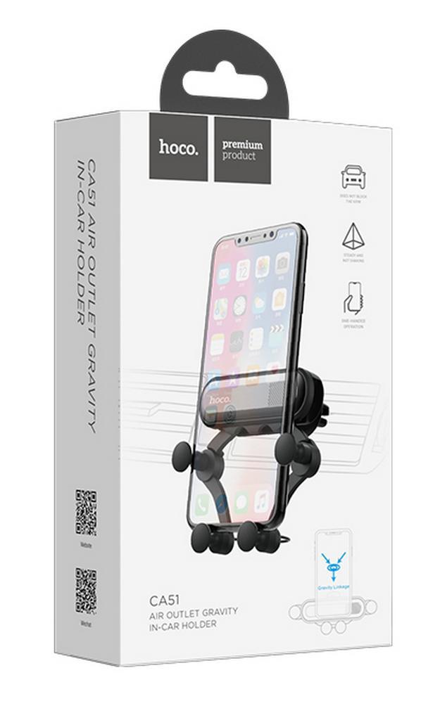 Βάση Στήριξης Αεραγωγού Αυτοκινήτου Hoco CA51 Μαύρη με περιστροφή 360 μοίρες προς διάφορες κατευθύνσεις, για συσκευές από 4’’ έως 6.5’’. Κατασκευασμένο από ABS, σιλικόνη και τεχνολογία επιφανειακής έγχυσης. Διαστάσεις 130x50x80mm και βάρος 52g.