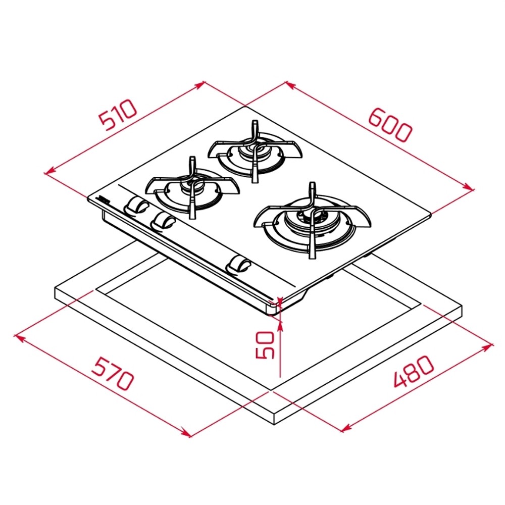 Κρυστάλλινη εστία αερίου 60cm χωρίς πλαίσιο με πίνακα ελέγχου με εργονομικούς περιστροφικούς διακόπτες και 3 ζώνες μαγειρέματος αερίου: