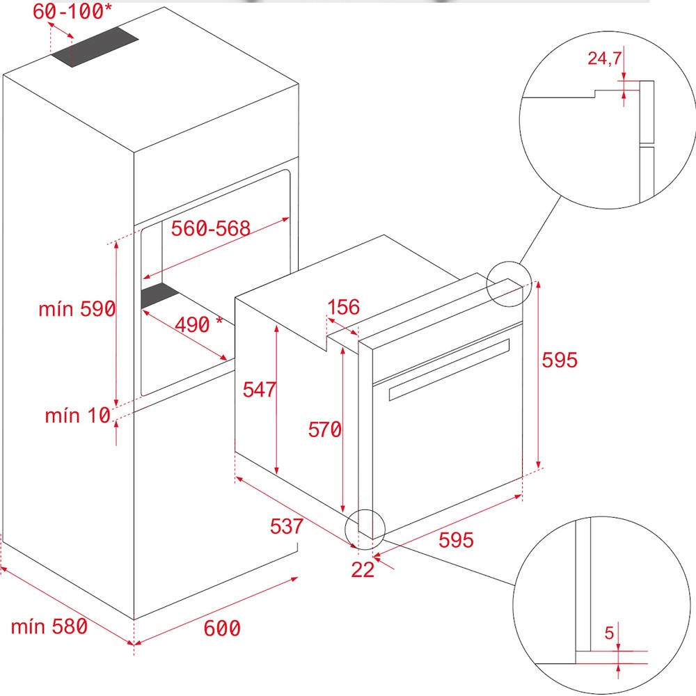 Οι εσωτερικές διαστάσεις του φούρνου είναι ύψος 364 mm, πλάτος 475 mm και βάθος 402 mm, ενώ οι εξωτερικές διαστάσεις είναι ύψος 595 mm, πλάτος 595 mm και βάθος 537+22 mm, με βάρος 32 κιλά. Ο φούρνος έχει πιστοποιήσεις N, CE, CCA, CB, GMARK, JAS-ANZ και SASO, και διαθέτει έναν θάλαμο. Η χαμηλότερη ρύθμιση θερμοκρασίας είναι 30ºC και η υψηλότερη 270ºC, ενώ προσφέρει 12 λειτουργίες ψησίματος και 20 συνταγές. Περιλαμβάνει λειτουργίες MaxGrill, κάτω αντίσταση, Turbo, ECO, ένζυμο, αυτόματη προθέρμανση, σιγοβράσιμο, αποσπώμενο σύστημα ταψιών, επιχρωμιωμένες πλευρικές σχάρες (5), πτυσσόμενο grill, εξαερισμό και Softclose.