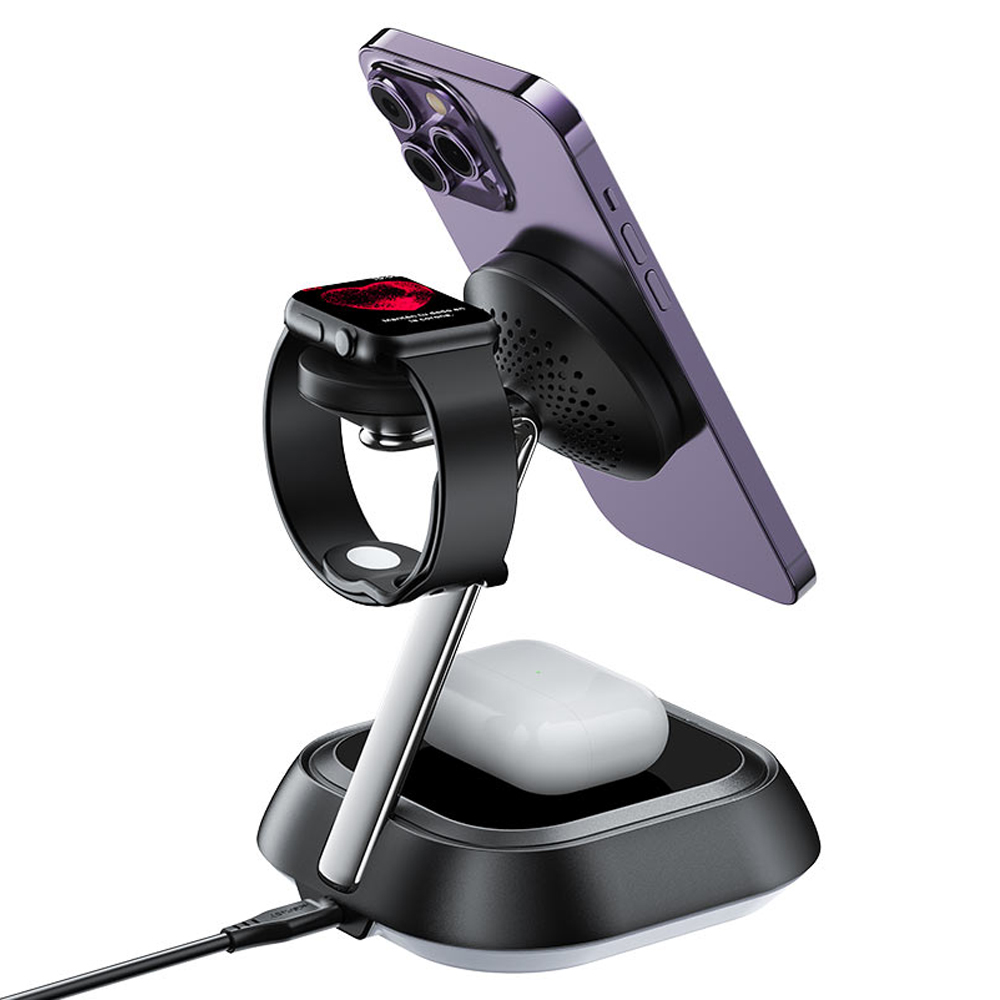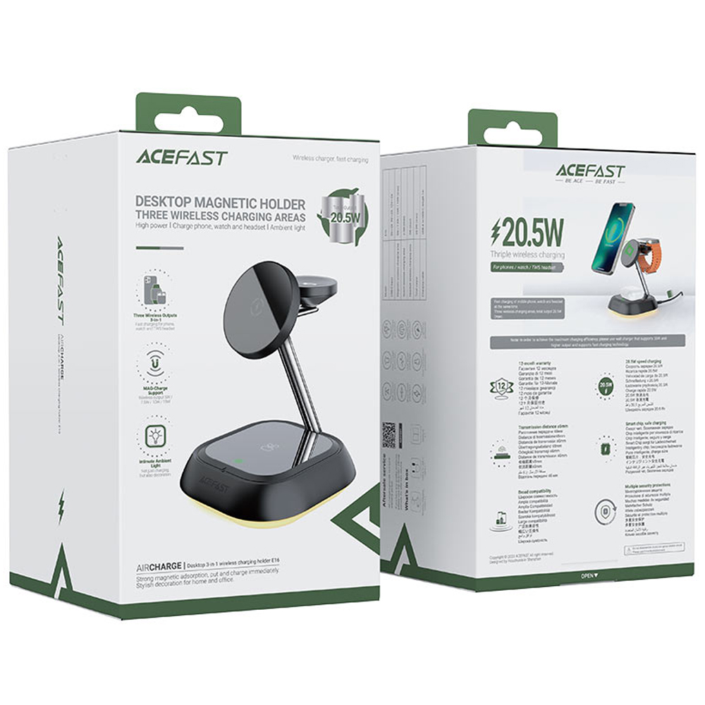 Η επιτραπέζια βάση Fast Wireless Charger Desktop Holder E16 είναι μαγνητικός ασύρματος φορτιστής για κινητό τηλέφωνο, ασύρματα ακουστικά (TWS) και έξυπνο ρολόι, με LED φωτισμό ατμόσφαιρας, υποστηρίζει μέγιστη ισχύ 20.5W και προσφέρει 3 σε 1 ασύρματη φόρτιση για ταυτόχρονη φόρτιση τριών συσκευών.