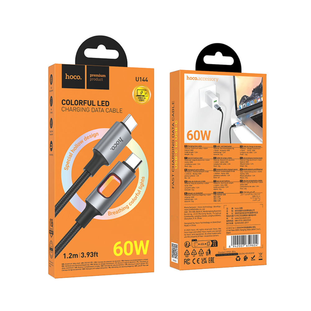 Καλώδιο Hoco U144 USB-C σε USB-C 60W Fast Charging 3A με Φωτισμό Braided Μαύρο 1.2m