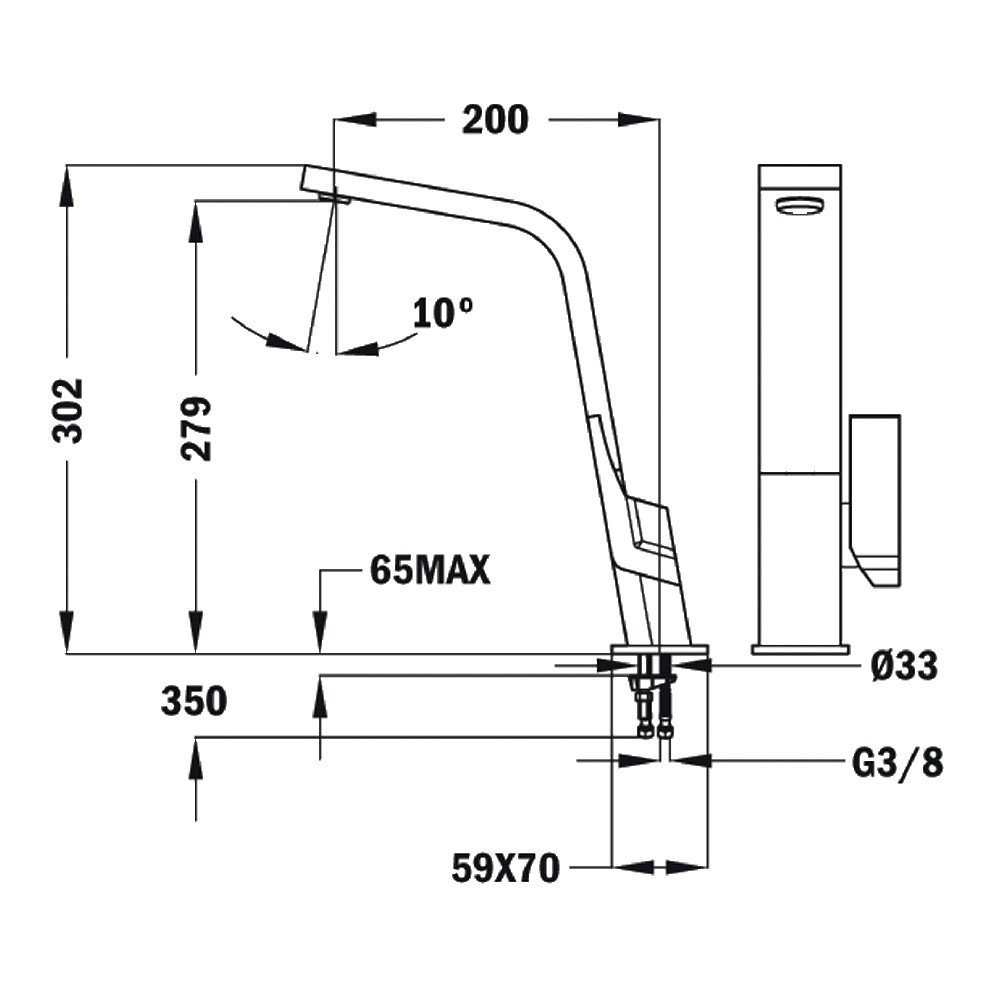 Η ψηλή μπαταρία νεροχύτη διαθέτει περιστρεφόμενο ρουξούνι και φίλτρο ροής νερού (aerator) που προστατεύει από τα άλατα. Ο μηχανισμός λειτουργεί με κεραμικούς δίσκους υψηλής αντοχής για αυξημένη διάρκεια ζωής. Οι σωλήνες σύνδεσης είναι εύκαμπτοι, με διαμέτρους 3/8’’ και αντάπτορα για σύνδεση με σωλήνες 1/2’’. Οι εσωτερικές διαστάσεις περιλαμβάνουν ύψος 279 mm και βάθος 200 mm, ενώ οι εξωτερικές διαστάσεις της μπαταρίας είναι ύψους 302 mm. Το συνολικό βάρος της μπαταρίας ανέρχεται στα 2,4 kg.