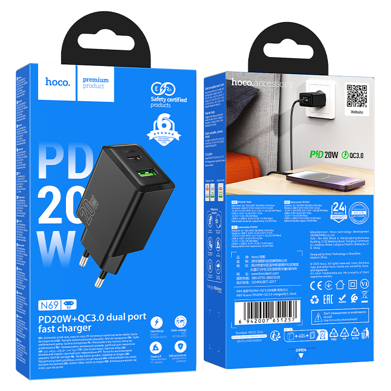 Travel Charger Hoco N69 Nuevo Dual Port PD20W 1xUSB-C and 1xUSB-A 5V QC3.0A Black