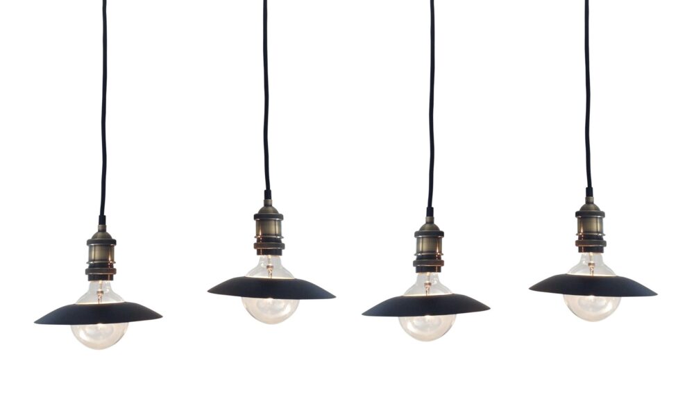 Metallic shade, black outside white inside with black fabric cable, antique bronze lampholder and rossette.