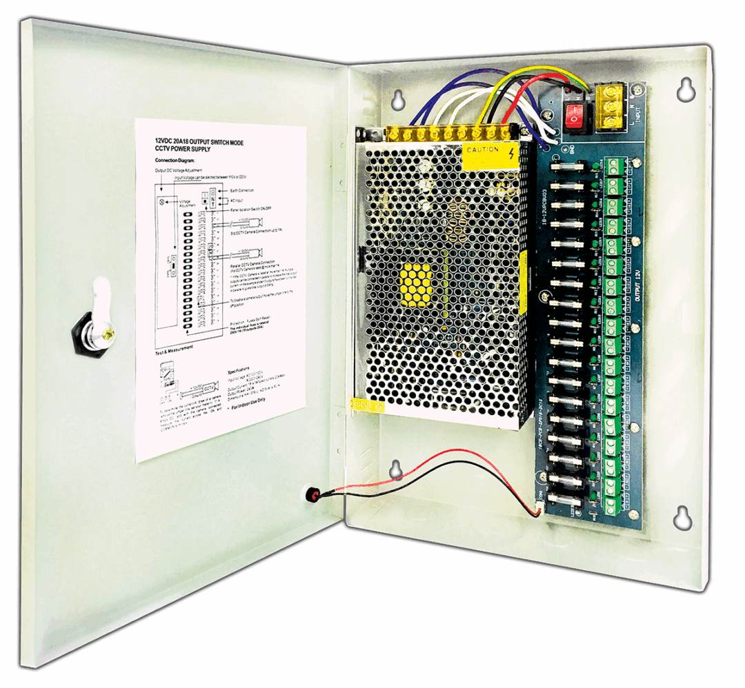 Τάση εισόδου: 100-120V/220-240 AC 50/60HzΤάση εξόδου: 12V DC Ρεύμα εξόδου: 20Α maxΚατανομή εξόδου: 18 κανάλια Χ 1 A max ανά έξοδο, ασφαλισμένη η κάθε μια με ασφάλεια (GLASS FUSE) Προστασία από: Bραχυκύκλωμα, υπερφόρτωση, υπέρτασηΕνδείξεις: Λειτουργιών με LEDΚατάλληλο για την: Τροφοδοσία καμερών PTZ, IR illuminators, VDR κ.αΔιαστάσεις: 316χ218χ60 mmBάρος: 2 kgr