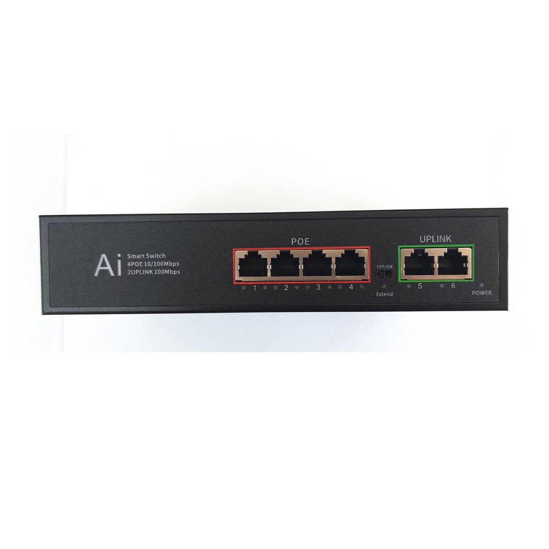 ANGA POE Switch(4+2 Built-in) PS-E5042B, 4 Port 10/100M, 1. POE Port: 4*10/100Mbps; Uplink Port: 2*10/100Mbps; 2. Built in DC52V 1.15A 65W Power