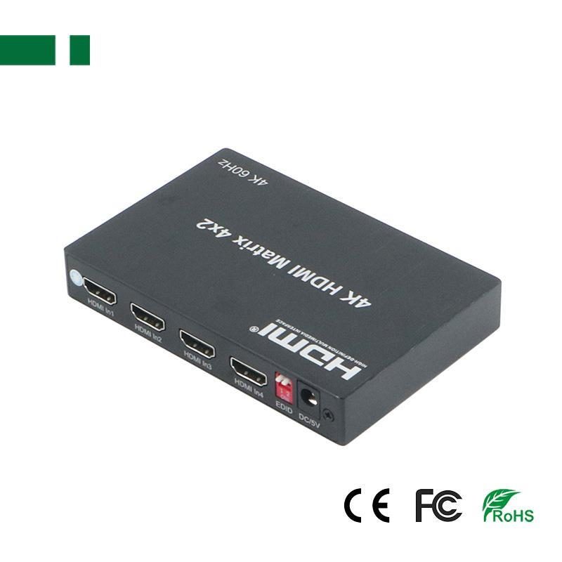 Το HDMI matrix 4×2@60Hz μπορεί να συνδέσει 4 πηγές σήματος HD σε 2 ακροδέκτες οθόνης HD με έξοδο οπτικών ινών ή στερεοφωνικών ακουστικών.