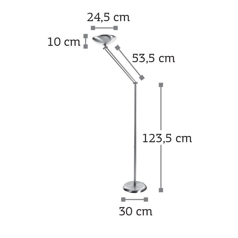 Πρόκειται για ένα νίκελ ματ μεταλλικό επιδαπέδιο φωτιστικό. Τόσο οι βραχίονες όσο και το καπάκι που καλύπτει τον λαμπτήρα κινούνται ώστε να λάβουν την επιθυμητή θέση. Το φως διαχέεται ομοιόμορφα στον χώρο.