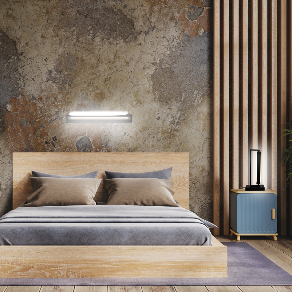 Πρόκειται για ένα μαύρο επιτοίχιο κινητό φωτιστικό οροφής μίνιμαλ σχεδίασης. Η λευκή ακρυλική του επιφάνεια καλύπτει τον LED φωτισμό θερμής απόχρωσης.
