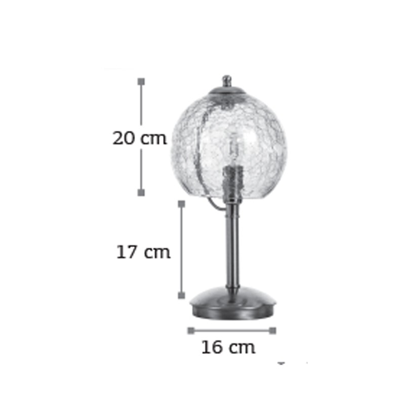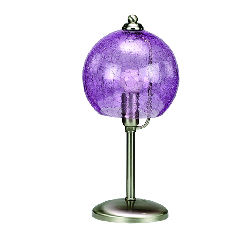 Πρόκειται για ένα νίκελ ματ επιτραπέζιο μεταλλικό φωτιστικό. Η λιτή του σχεδίαση συμπληρώνεται με το μοβ κρακελέ γυαλί.