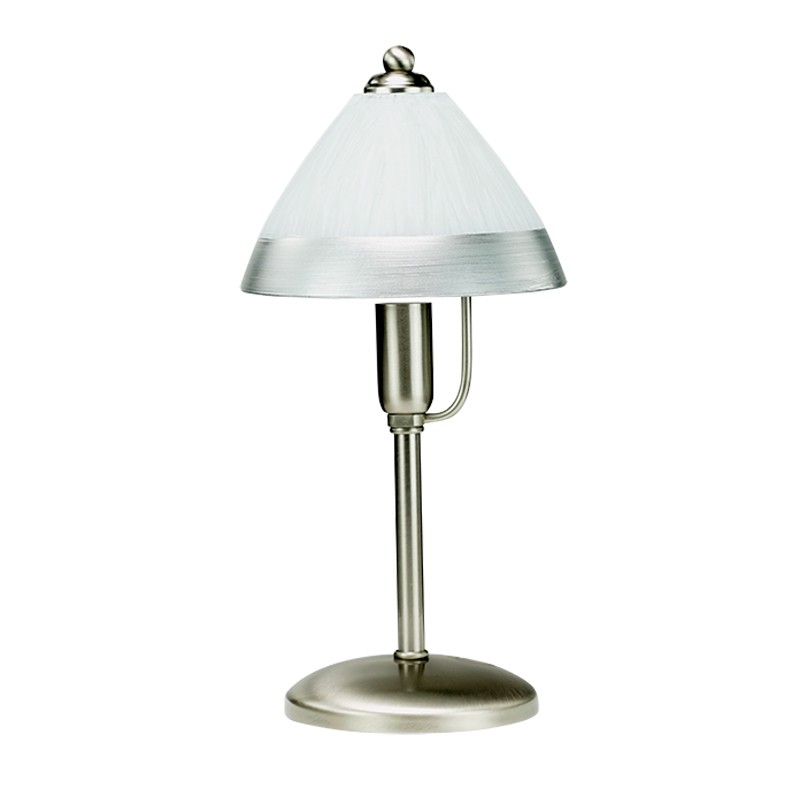 Πρόκειται για ένα νίκελ ματ επιτραπέζιο φωτιστικό. Το γυαλί συνδυάζει το λευκό και το ασημί καθιστώντας το ιδιαίτερο καλύπτοντας ταυτόχρονα τον λαμπτήρα.