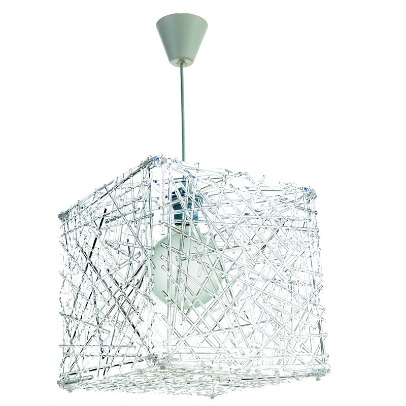 Πρόκειται για ένα κρεμαστό φωτιστικό από διάφανο plexiglass και λευκή ανάρτηση. Ένας ιδιαίτερης σχεδίασης κύβος που το ύψος του προσαρμόζεται στον κάθε χώρο.