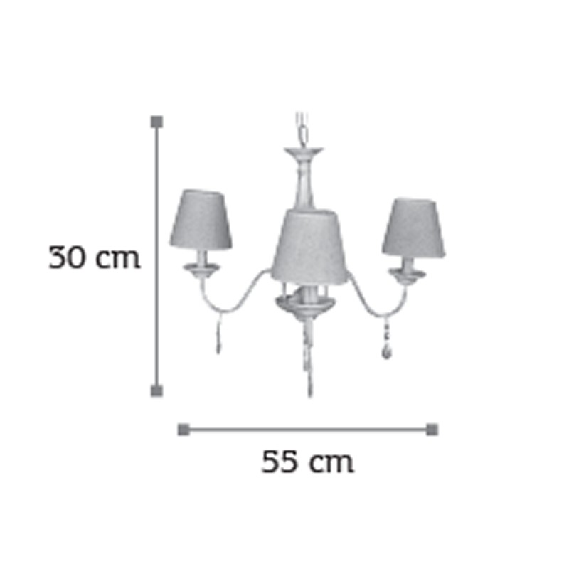 Πρόκειται για ένα μεταλλικό κρεμαστό φωτιστικό σε απόχρωση λευκής πατίνας με τρεις λαμπτήρες. Τα κρύσταλλα δίνουν μια επιπλέον λάμψη, αλλά μπορούν και να αφαιρεθούν. Το υφασμάτινο καπέλο δίνει μια ρομαντική ατμόσφαιρα. Η μεταλλική ανάρτηση είναι ρυθμιζόμενη για να προσαρμοστεί στον κάθε χώρο.