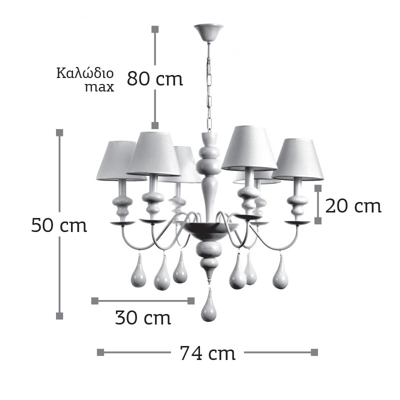 Πρόκειται για ένα λευκό μεταλλικό κρεμαστό φωτιστικό με έξι λαμπτήρες. Την ιδιαίτερη σχεδίασή του συμπληρώνουν τα λευκά υφασμάτινα καπέλα που καλύπτουν τους λαμπτήρες αλλά και οι λευκές γυάλινες σταγόνες που κρέμονται. Η ανάρτηση είναι ρυθμιζόμενη ώστε να προσαρμόζεται στον κάθε χώρο.