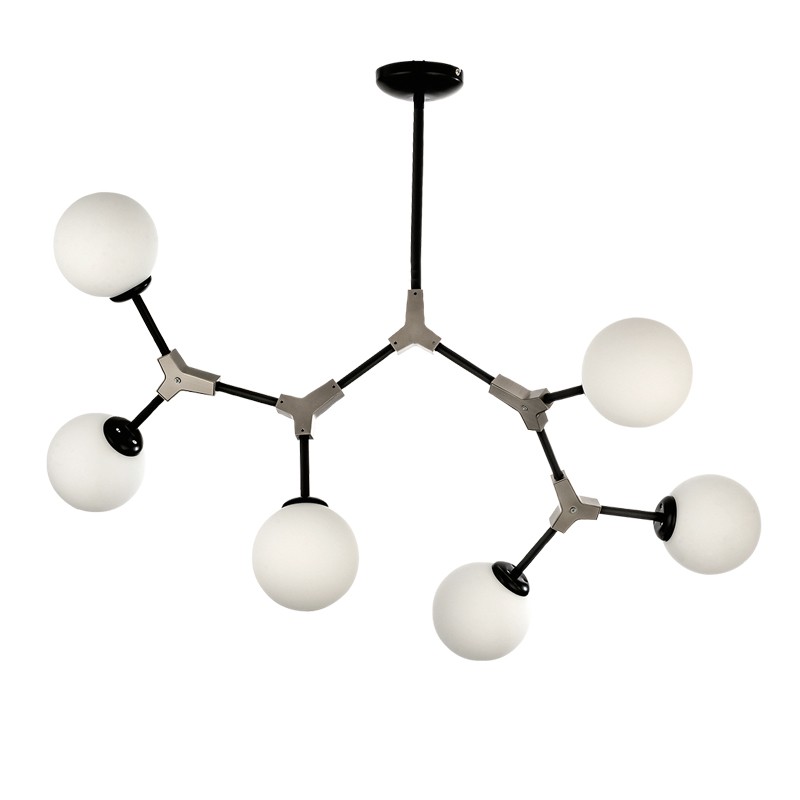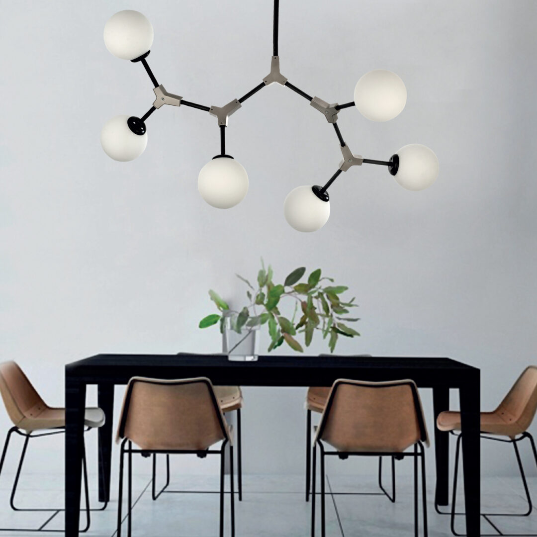 Πρόκειται για ένα κρεμαστό φωτιστικό από μαύρο μέταλλο και νίκελ ματ λεπτομέρειες. Η λευκή οπαλίνα δένει αρμονικά με το υπόλοιπο σώμα και διαχέει το φως ομοιόμορφα σε όλον τον χώρο. Οι βραχίονες κινούνται για να πάρουν το επιθυμητό σχήμα.