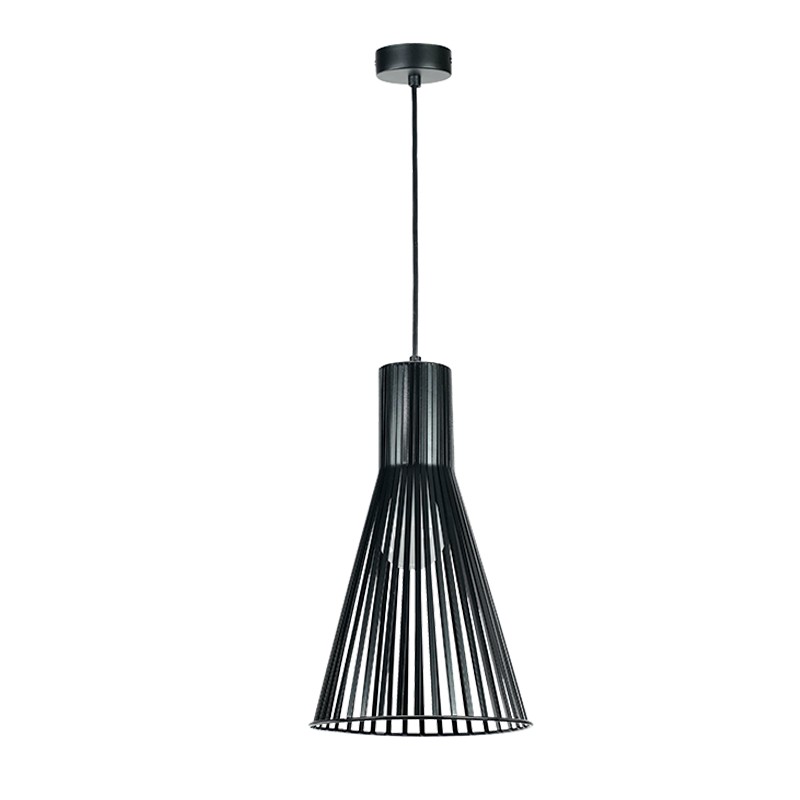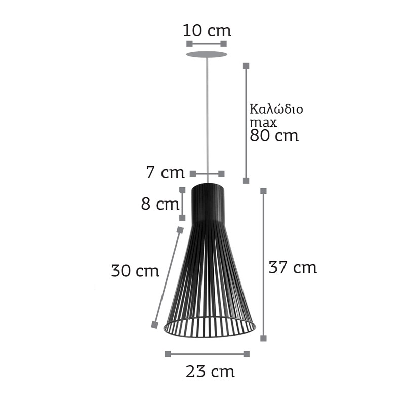 Πρόκειται για ένα μαύρο μεταλλικό κρεμαστό φωτιστικό σε κωνική διάτρητη σχεδίαση. Μπορεί να τοποθετηθεί είτε μόνο του είτε δύο ή τρία μαζί σε ροζέτα ή ράγα. Η ανάρτησή του είναι ρυθμιζόμενη για να προσαρμόζεται στον κάθε χώρο.
