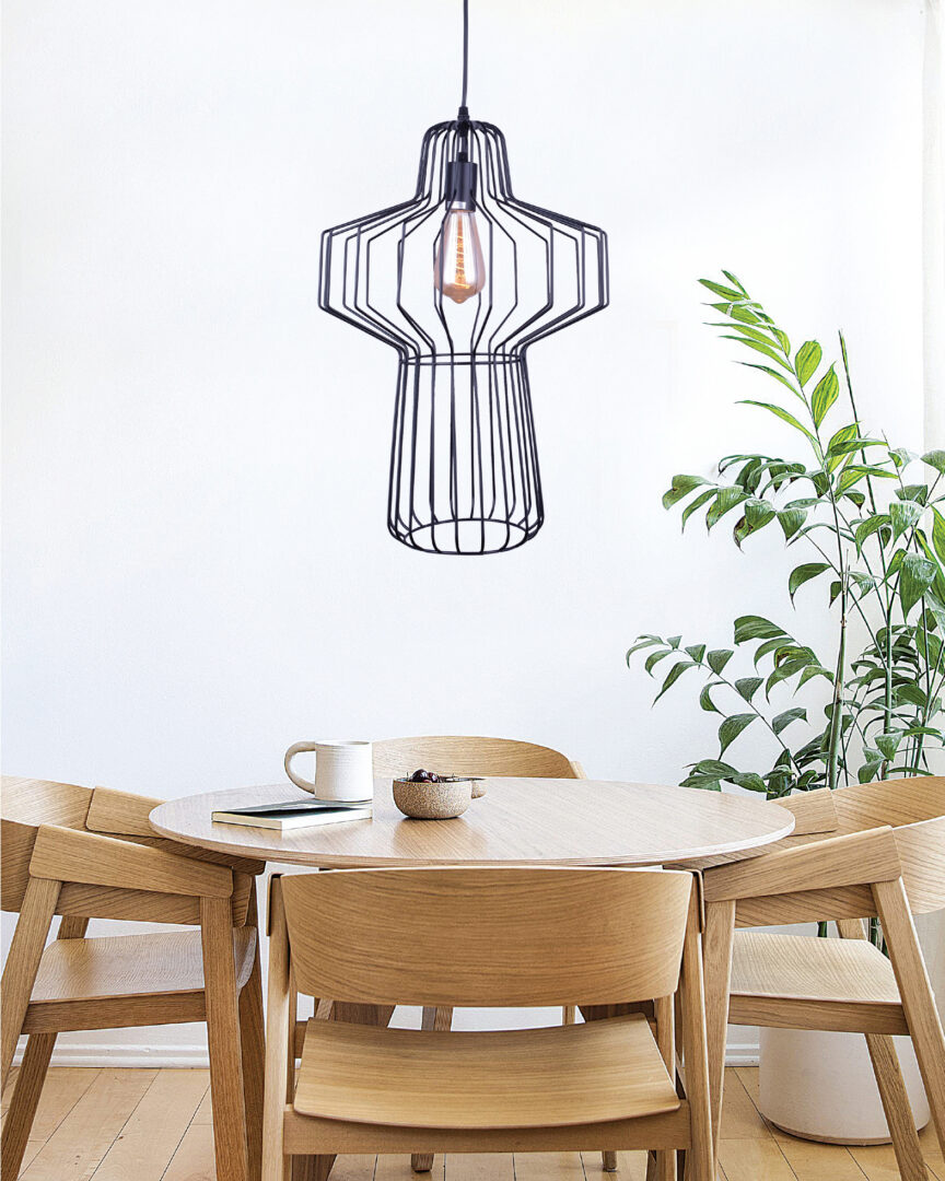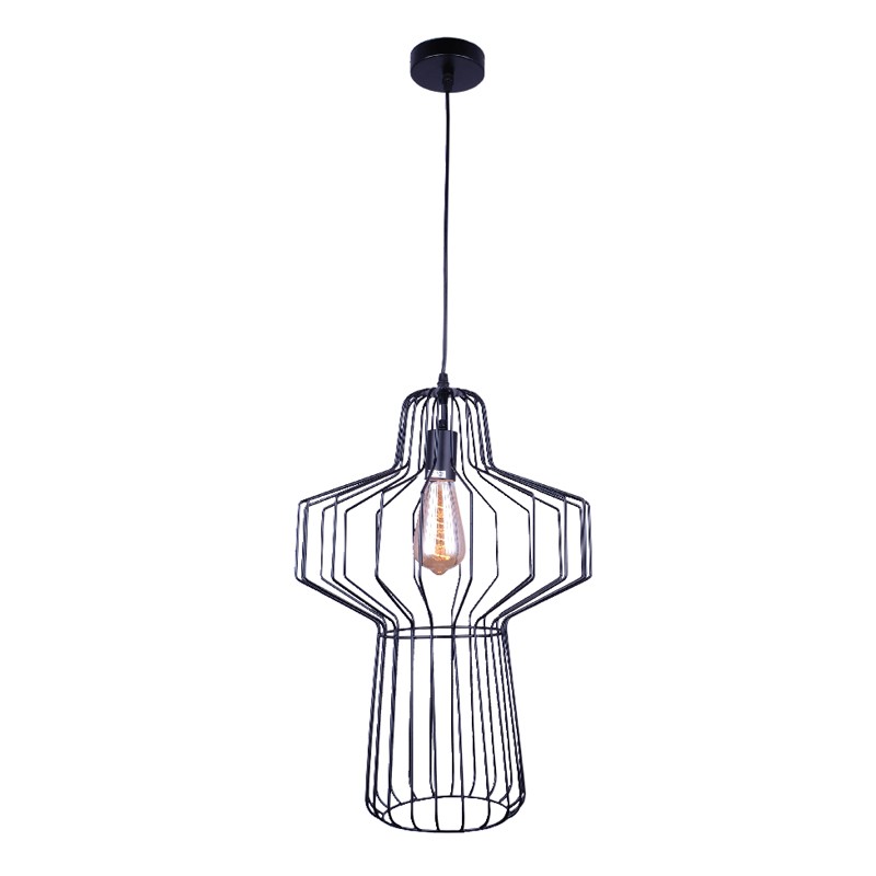Πρόκειται για ένα μαύρο μεταλλικό κρεμαστό φωτιστικό σε ιδιαίτερη διάτρητη σχεδίαση. Η ανάρτησή του είναι ρυθμιζόμενη για να προσαρμόζεται στον κάθε χώρο.