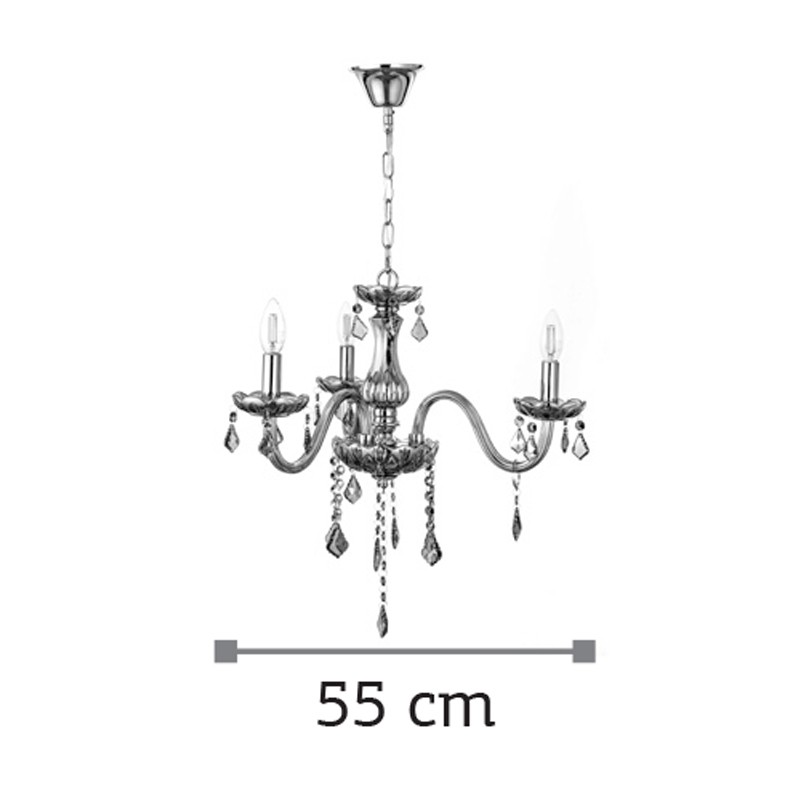 Πρόκειται για ένα φιμέ γυάλινο κρεμαστό φωτιστικό με τρεις λαμπτήρες. Τόσο τα φιμέ κρύσταλλα που κρέμονται όσο και οι χρώμιο μεταλλικές λεπτομέρειες του προσδίδουν μια επιπλέον λάμψη. Η χρώμιο μεταλλική ανάρτηση είναι ρυθμιζόμενη και προσαρμόζεται στον κάθε χώρο.