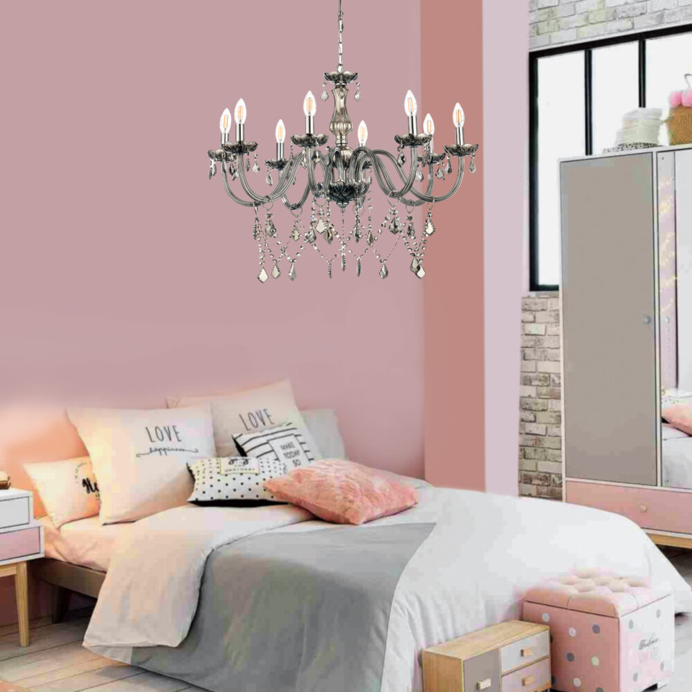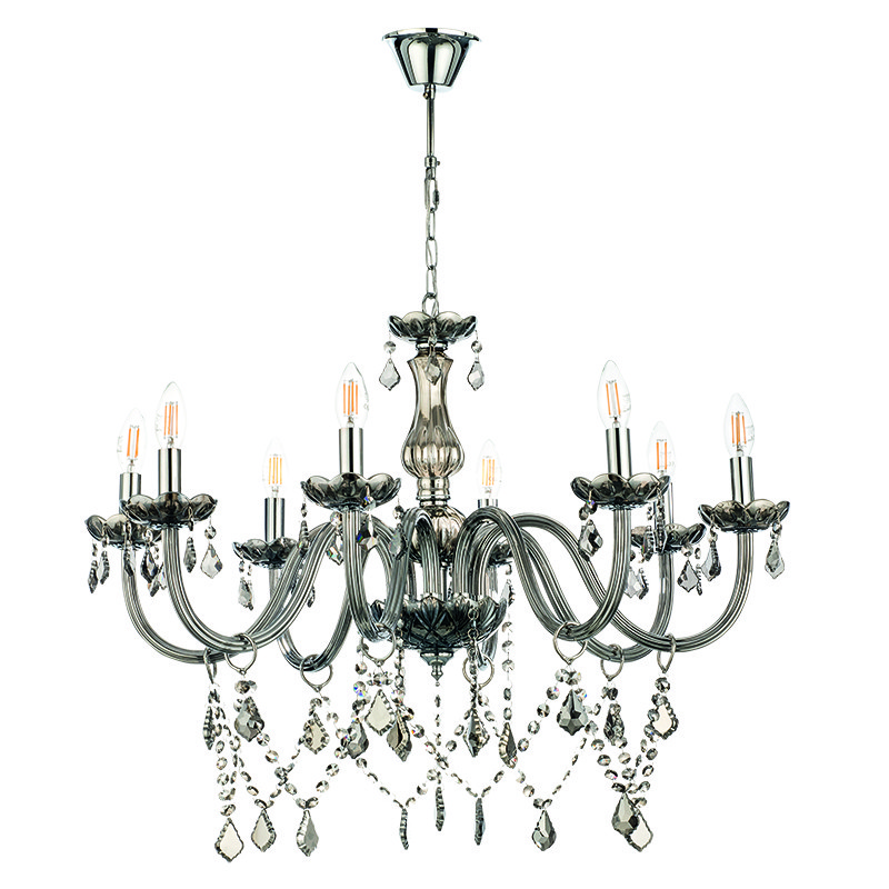 Πρόκειται για ένα φιμέ γυάλινο κρεμαστό φωτιστικό με οχτώ λαμπτήρες. Τόσο τα φιμέ κρύσταλλα που κρέμονται όσο και οι χρώμιο μεταλλικές λεπτομέρειες του προσδίδουν μια επιπλέον λάμψη. Η χρώμιο μεταλλική ανάρτηση είναι ρυθμιζόμενη και προσαρμόζεται στον κάθε χώρο.