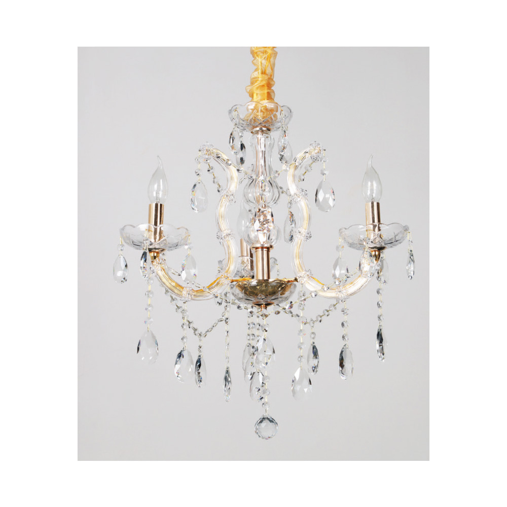 Πρόκειται για ένα κρεμαστό φωτιστικό με τρείς λαμπτήρες. Το σώμα του αποτελείται από χρυσό μέταλλο που καλύπτεται από διάφανο γυαλί. Τα κρύσταλλα που το διακοσμούν είναι διάφανα. Η μεταλλική ανάρτηση είναι ρυθμιζόμενη ώστε να προσαρμόζεται στον κάθε χώρο. Διατίθεται και η επιλογή του υφασμάτινου καπέλου το οποίο πρέπει να ζητηθεί επιπλέον.