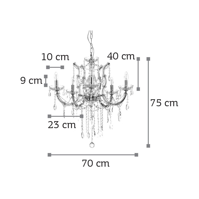 Πρόκειται για ένα κρεμαστό φωτιστικό με έξι λαμπτήρες. Το σώμα του αποτελείται από χρώμιο μέταλλο που καλύπτεται από διάφανο γυαλί. Τα κρύσταλλα που το διακοσμούν είναι διάφανα. Η μεταλλική ανάρτηση είναι ρυθμιζόμενη ώστε να προσαρμόζεται στον κάθε χώρο. Διατίθεται και η επιλογή του υφασμάτινου καπέλου το οποίο πρέπει να ζητηθεί επιπλέον.