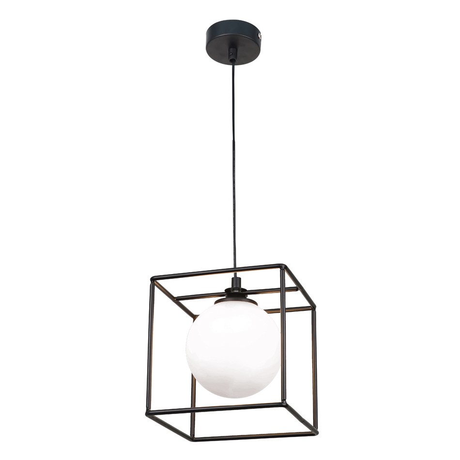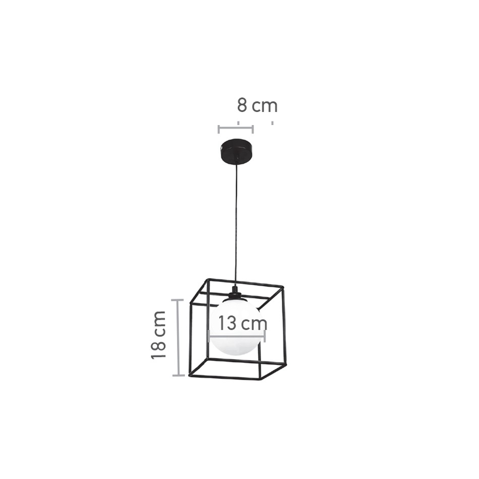 Πρόκειται για ένα γεωμετρικό φωτιστικό κατασκευασμένο από μαύρο μέταλλο και λευκή οπαλίνα. Το ύψος του φωτιστικού είναι ρυθμιζόμενο και το φως διαχέεται ομοιόμορφα.