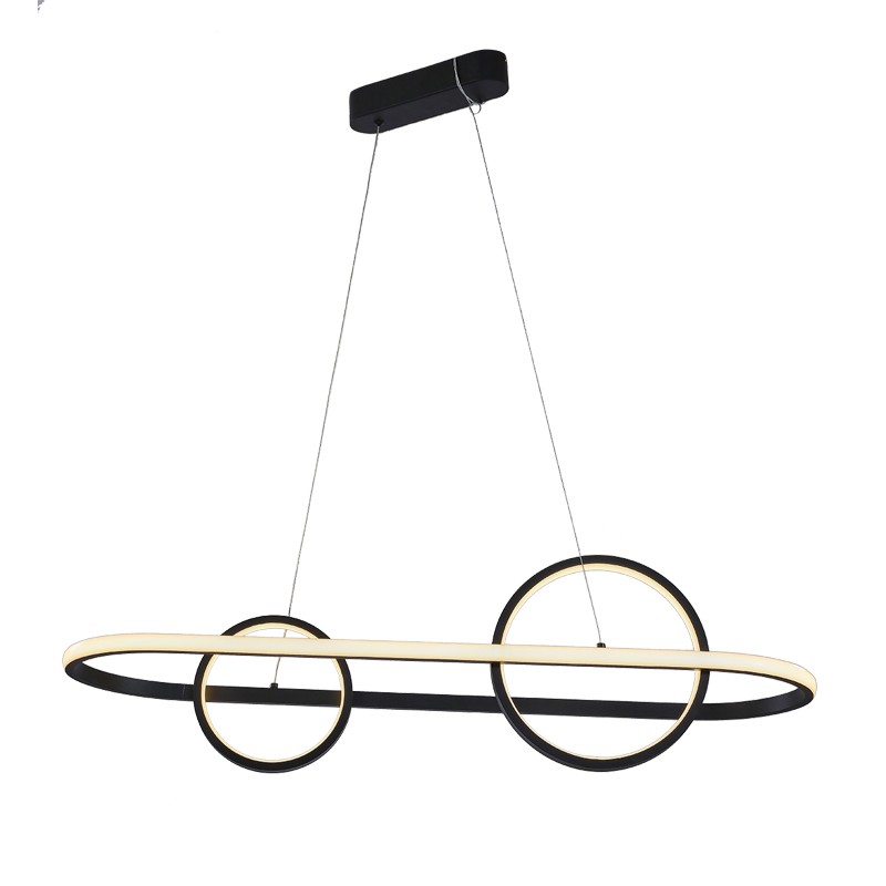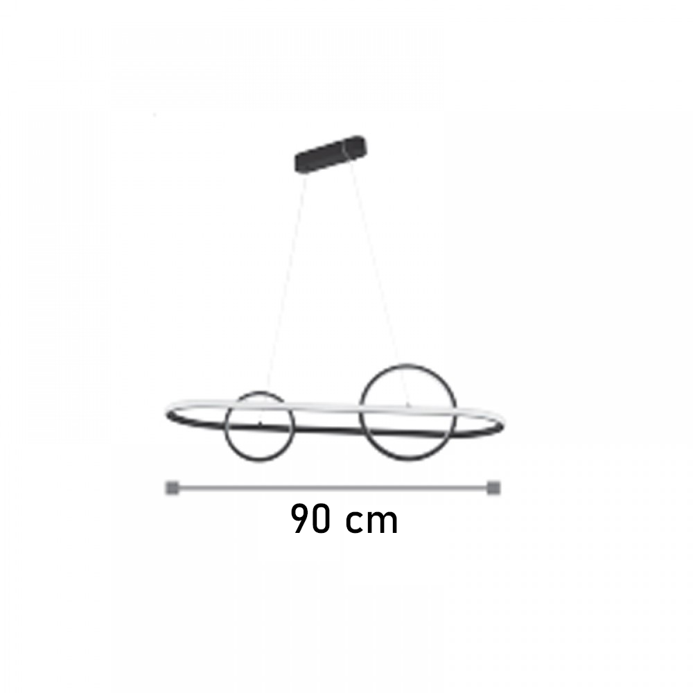 Πρόκειται για ένα μαύρο κρεμαστό φωτιστικό με κυκλική σχεδίαση κατασκευασμένο από αλουμίνιο. Η λευκή ακρυλική του επιφάνεια καλύπτει τον led φωτισμό θερμής απόχρωσης. Η ανάρτησή του είναι ρυθμιζόμενη ώστε να προσαρμόζεται στον κάθε χώρο.