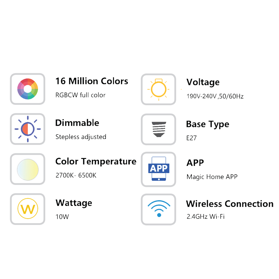 Πρόκειται για έναν λαμπτήρα led που καλύπτει φωτισμό από θερμής ως και ψυχρής απόδοσης. Επιπλέον δίνεται η δυνατότητα χρωματιστής απόδοσης φωτισμού μέσω της εφαρμογής Magic Home App και η σύνδεση επιτυγχάνεται ασύρματα.