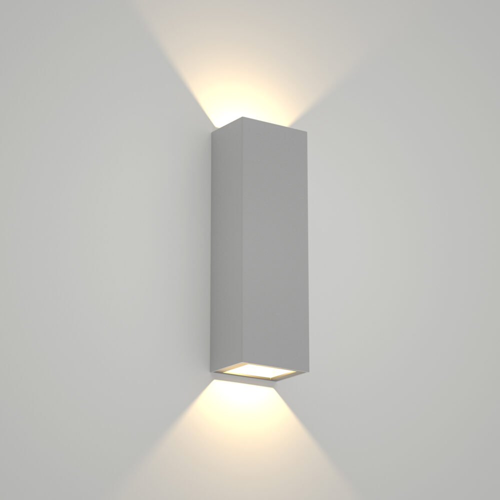 Επιτοίχιο φωτιστικό LED από την οικογένεια Lanier σε γκρί χρώμα. Η θερμοκρασία χρώματος είναι 3000K.