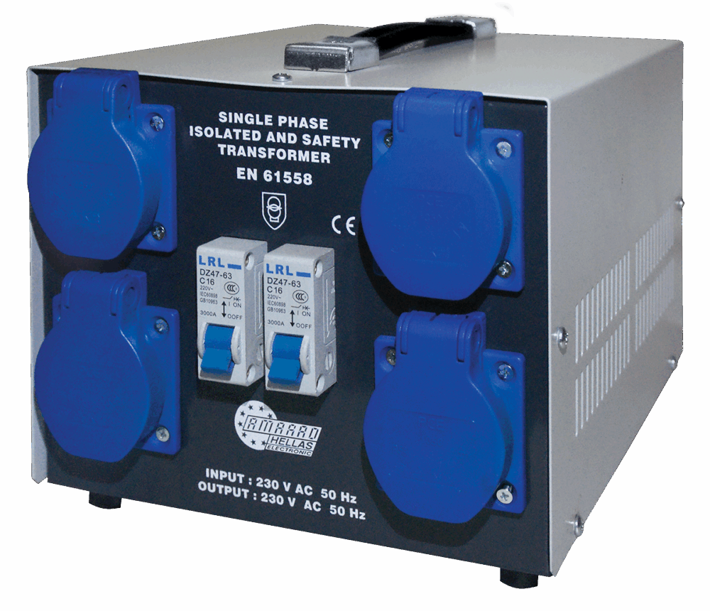 Ο φορητός μετασχηματιστής απομόνωσης κατασκευάζεται αποκλειστικά από την εταιρεία μας σύμφωνα με το Ευρωπαϊκό πρότυπο ασφαλείας IEC 61558-2-6 και φέρουν σήμανση CE.Κατάλληλος για την: Aπομόνωση της φάσης του δικτύου από τις συνδεδεμένες συσκευές-εργαλεία και την προστασία του χρήστη από ηλεκτροπληξία.Διαθέτει: 4 εξόδους με πρίζες σούκο ασφαλισμένες με ασφάλεια πίνακα ανα δύο καθώς και χερούλι για εύκολη μεταφορά.