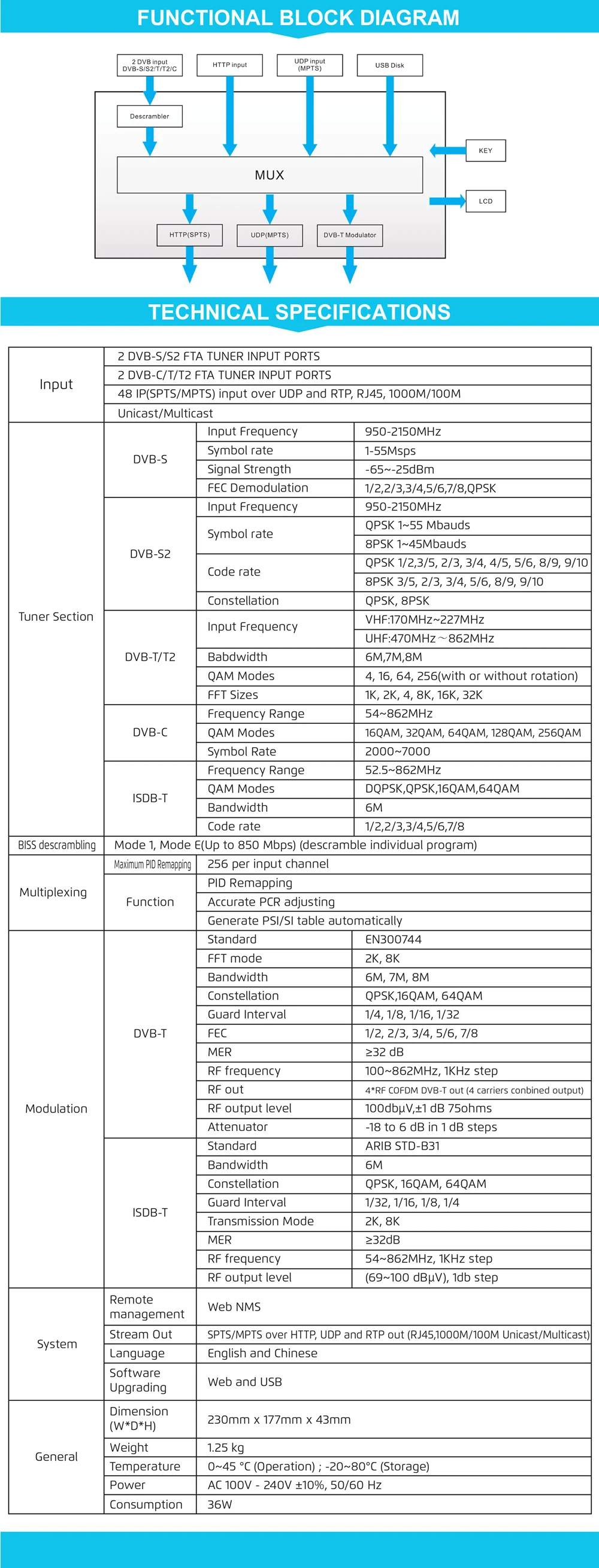 ST8631 is a transponder that converts DVB signals into IP signals or DVB-T signals. It receives the programs of up to two channels or transponders, selects the programs they need and packs them into a new data stream, pushes the IP stream, or re-modulates it into a DVB-T signal and sends it out.This machine can directly configure the parameters by the buttons, or connect to the network through the Ethernet port and use the PC-side tools for quick configuration. It can also group multiple machines into a network, and realize remote monitoring and setting through the Ethernet network.